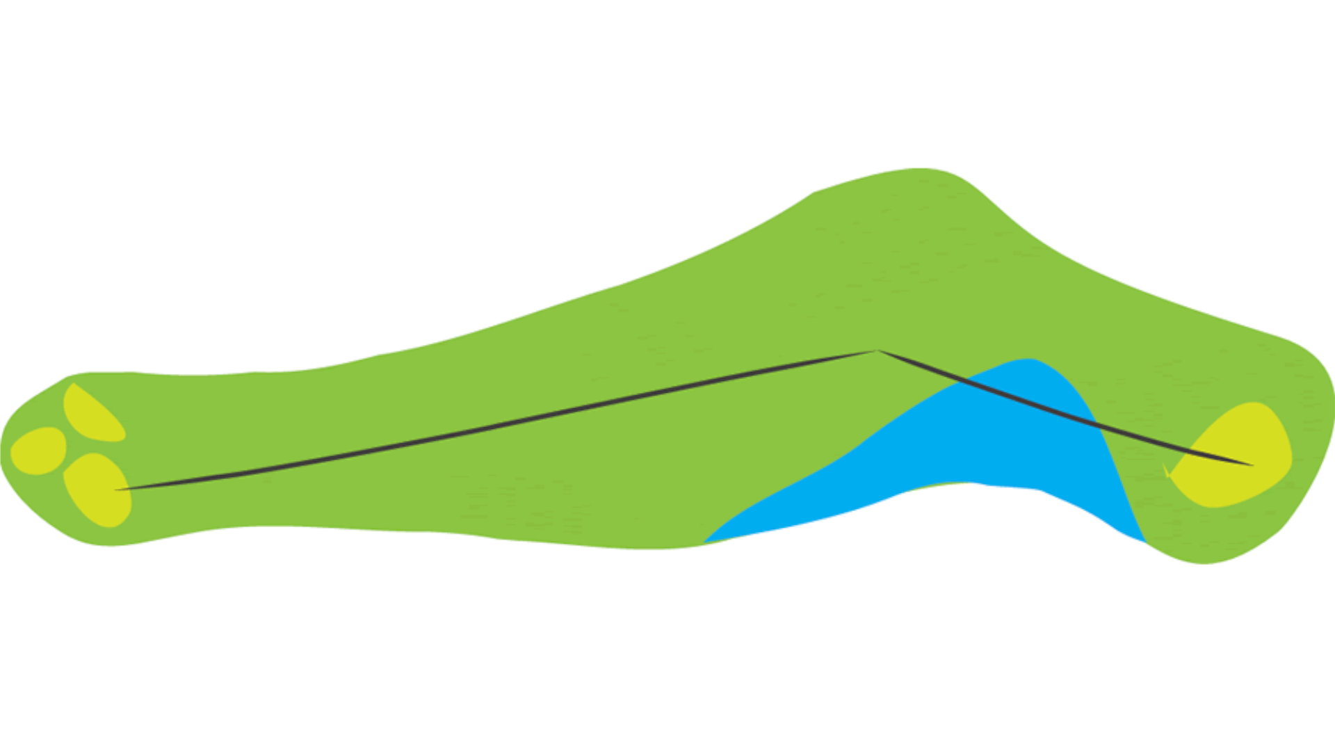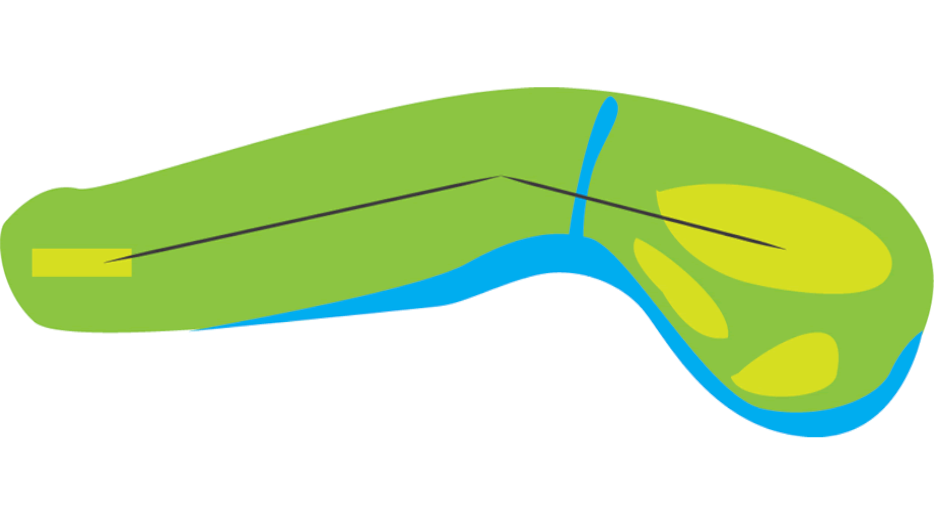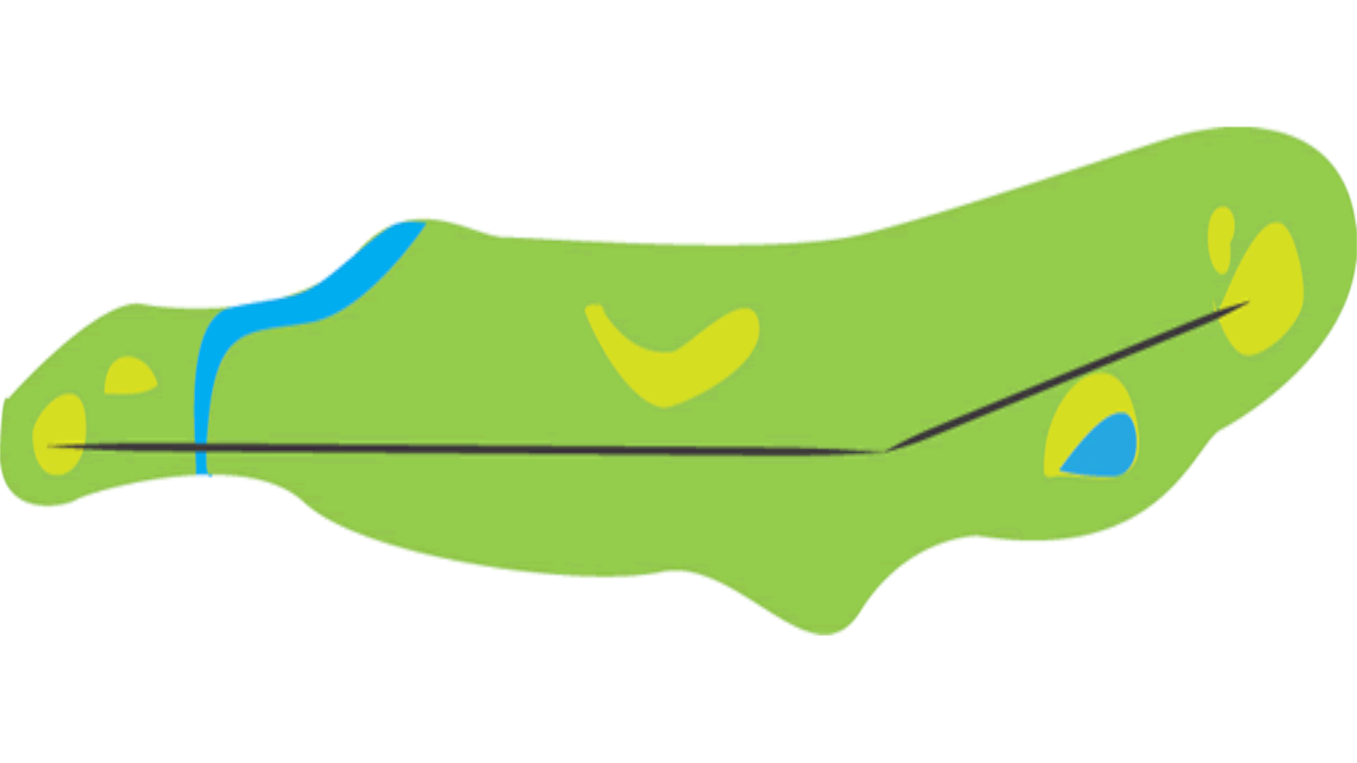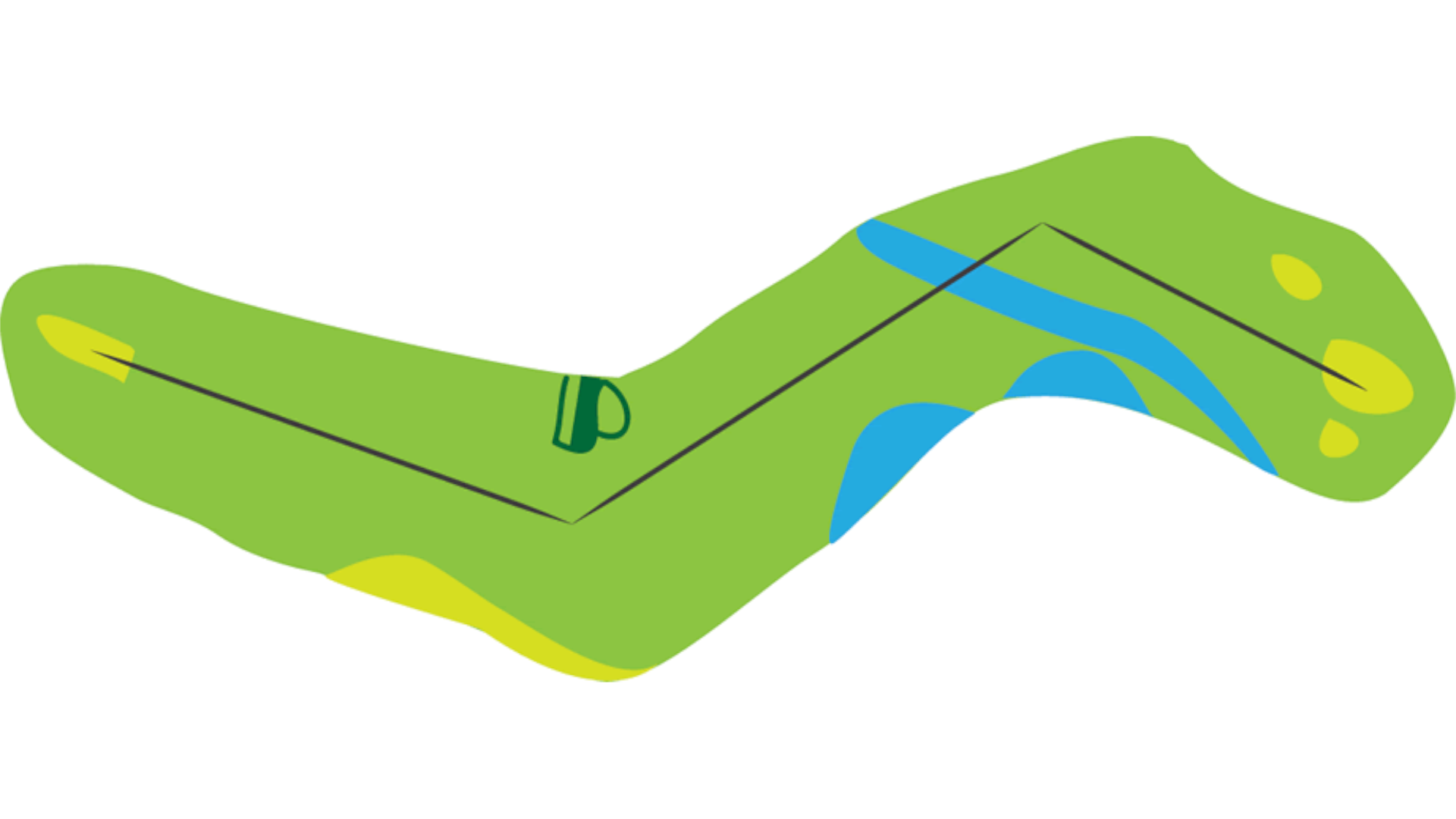 The short route to the green is via a good drawn drive to beyond the corner and on the left side of the fairway. This enables a second shot to the green which aims away from the water hazard on the left.