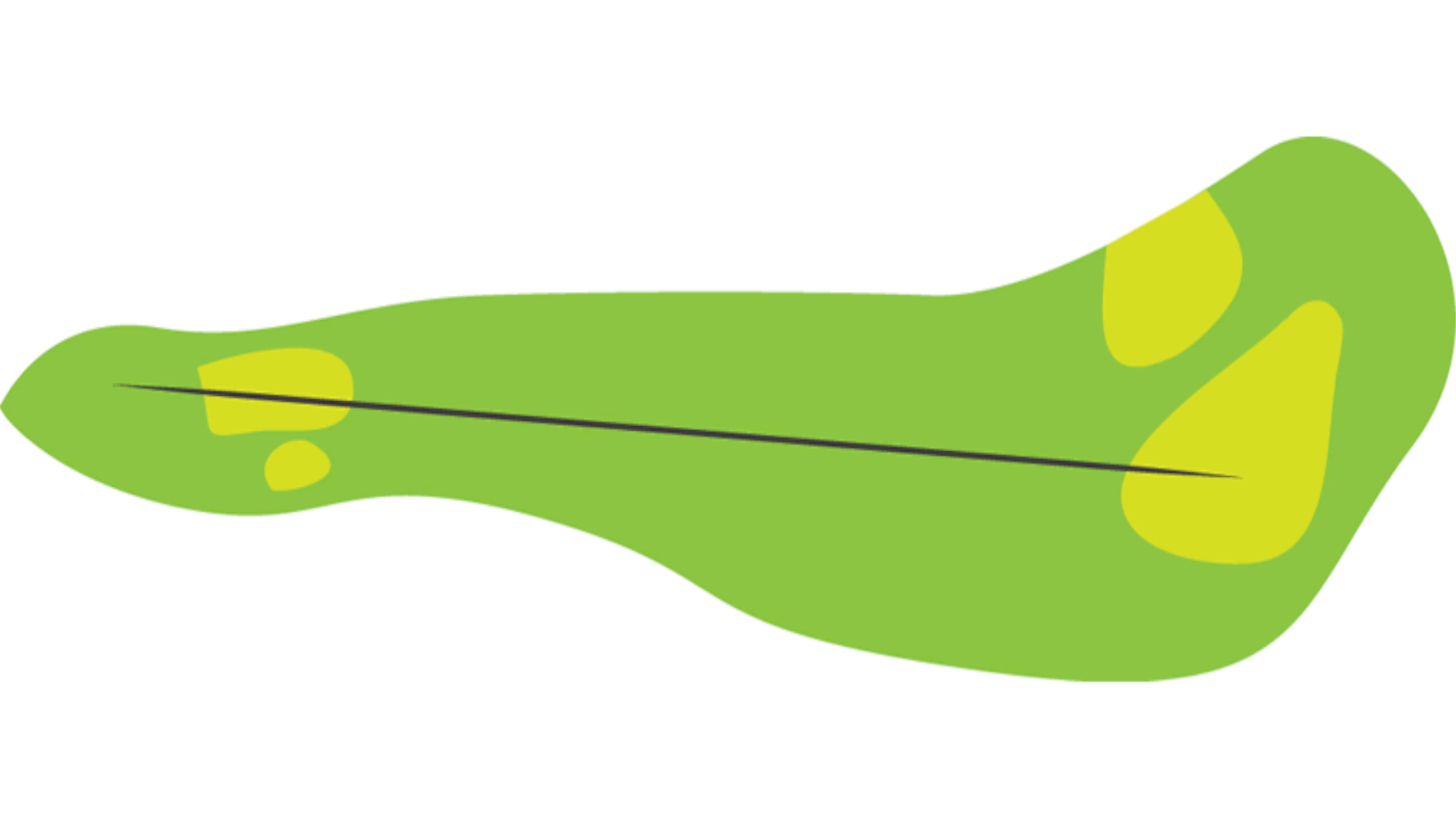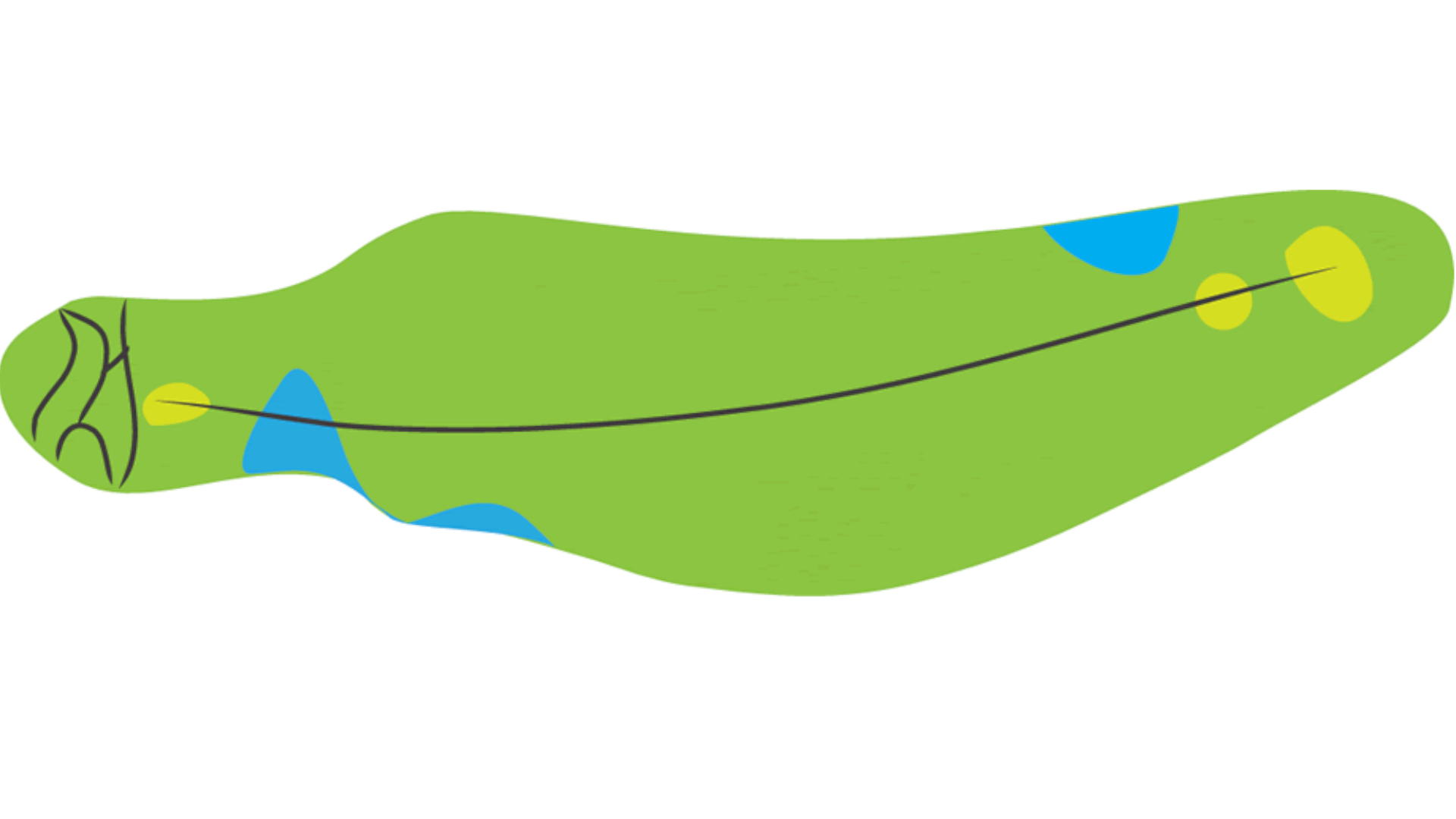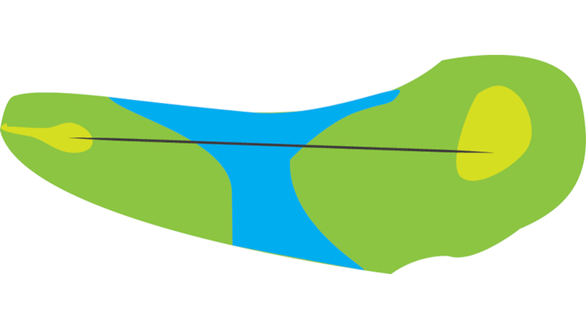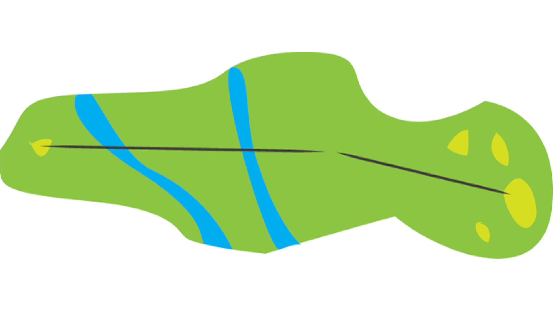 The short route to the green is via a good drawn drive to beyond the corner and on the left side of the fairway. This enables a second shot to the green which aims away from the water hazard on the left.