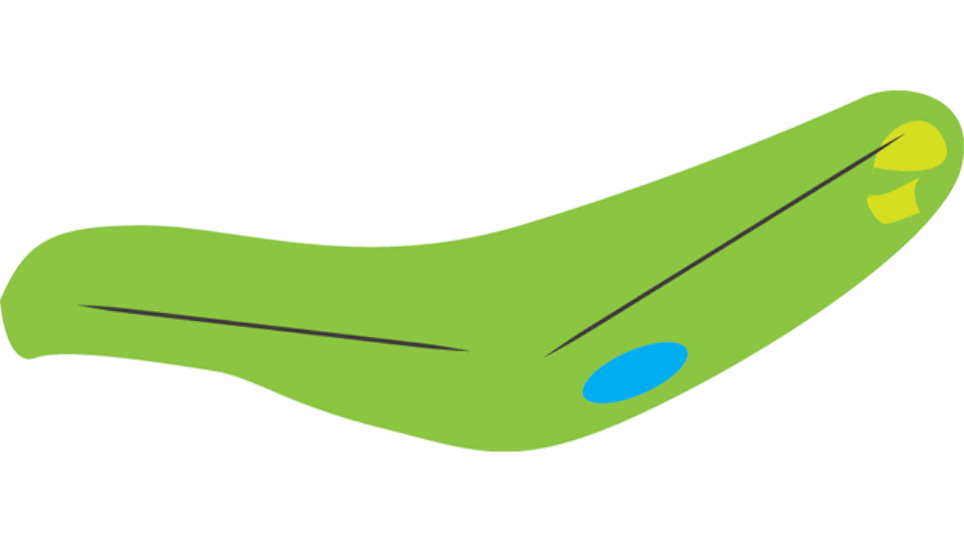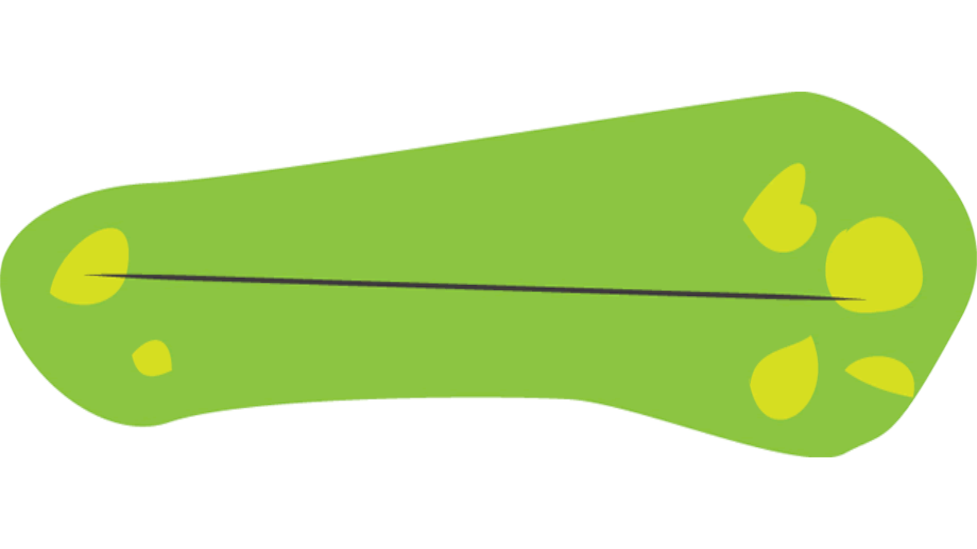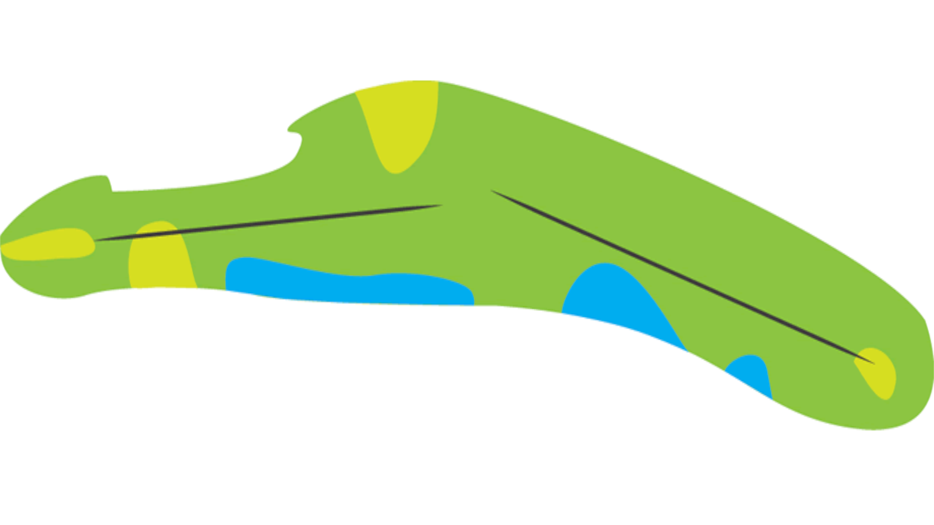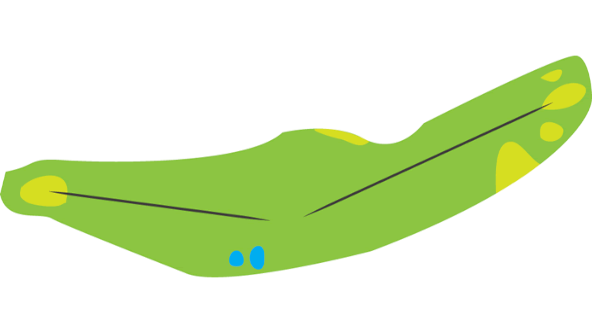 The short route to the green is via a good drawn drive to beyond the corner and on the left side of the fairway. This enables a second shot to the green which aims away from the water hazard on the left.