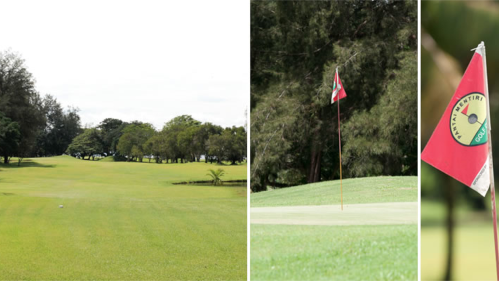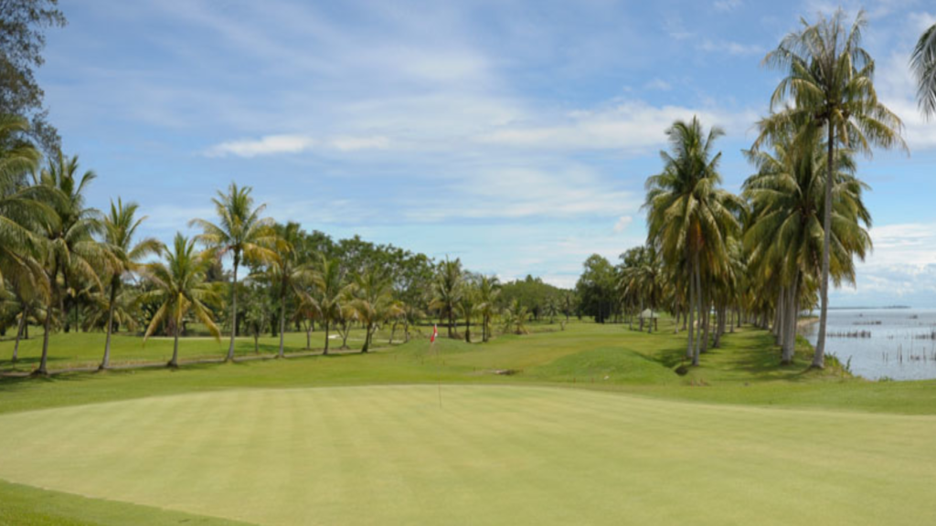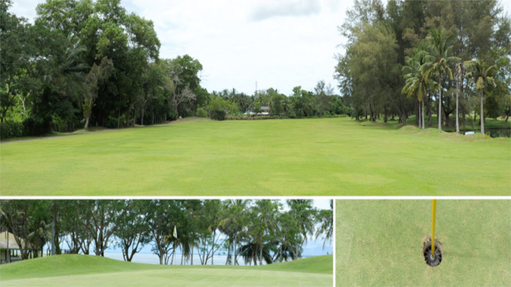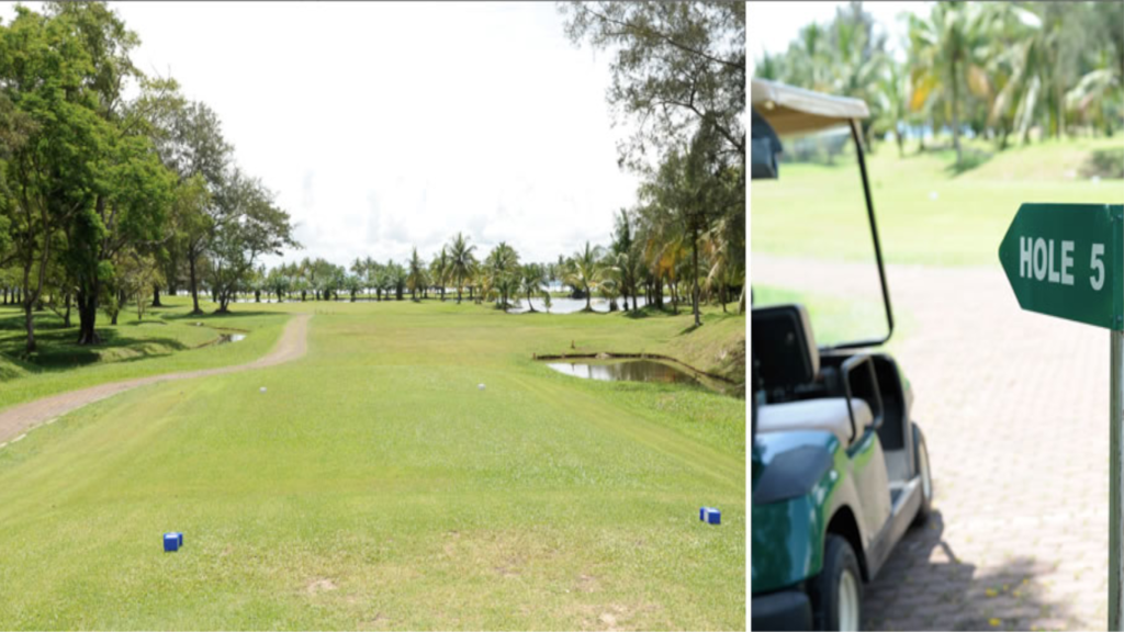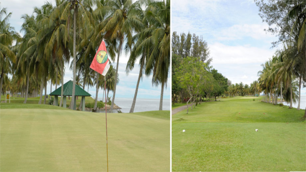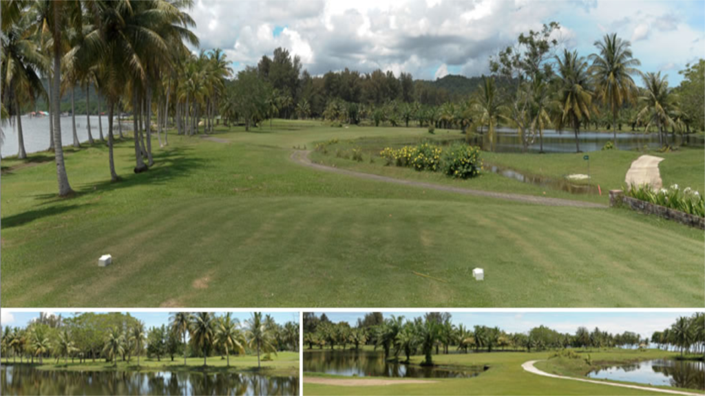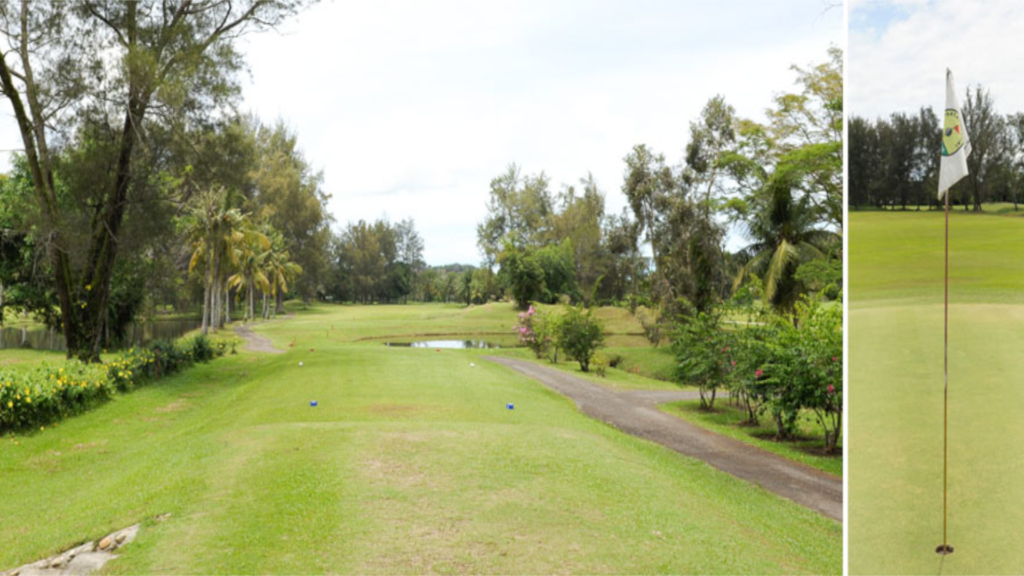 A difficult hole which demands a strategically placed tee shot centre left of the fairway in order to avoid the trees and leave a long iron second shot over the pond. A mangrove swamp is located all the way on the left of the fairway right up to behind the green. Bunkers on the left and right sides protect the green.