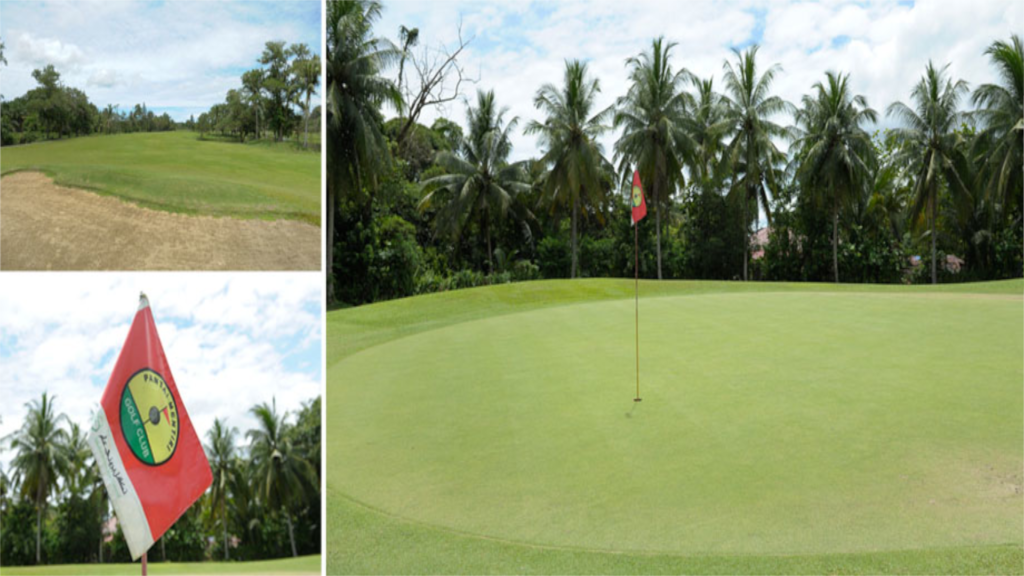 The tee box is raised and permits a good view of the slight dogleg left OB on the left from the tee to 110 meters from the green. The tee shot needs a good 160 – 170 meters carry over the pond. Keep clear of the trees on the left. A bunker on the front left and a ridge on each side protect the green. A trench runs on the right of the fairway.